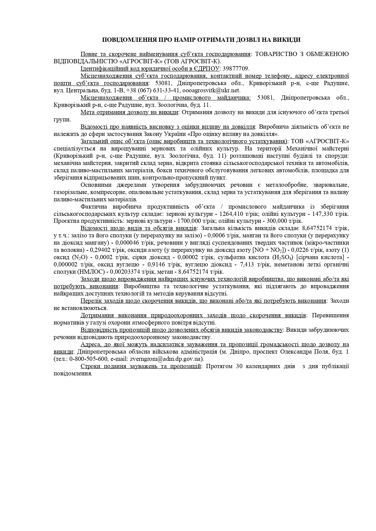 Повідомлення про намір отримати дозвіл на викиди (вул. Зоологічна, буд. 8А)